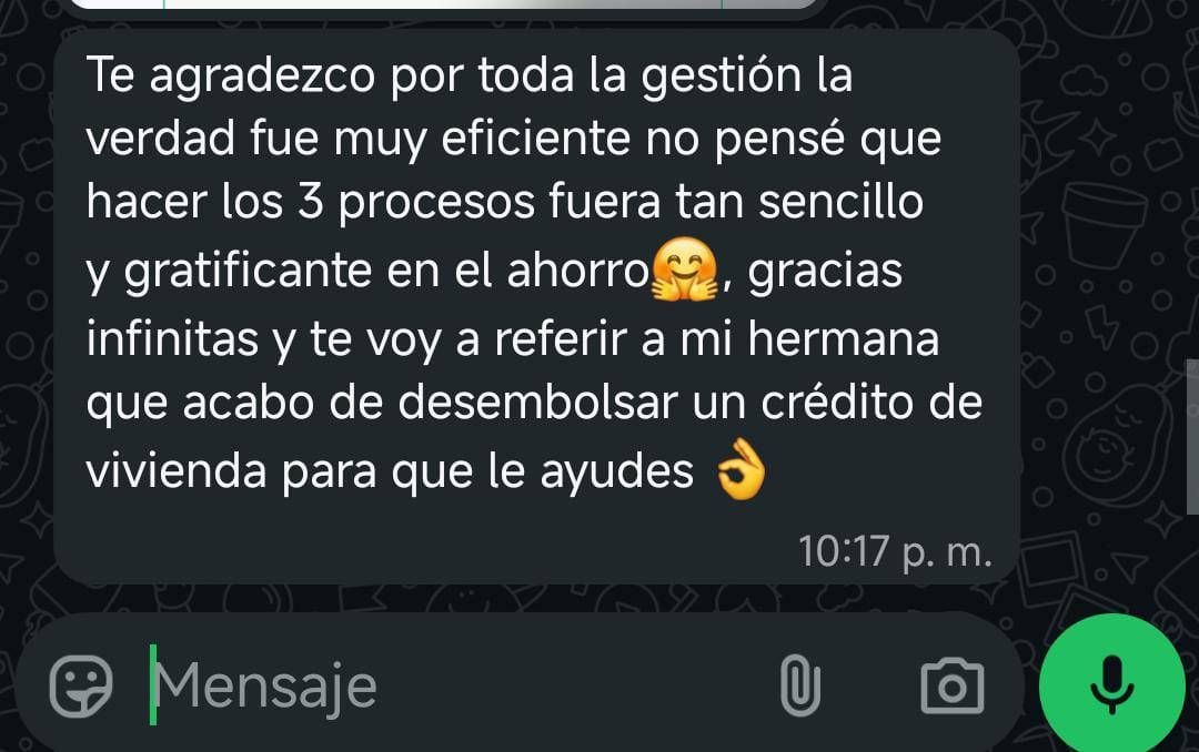 Bróker financiero con experiencia de mas de 10 años en sector bancario y asegurador, actualmente CEO de la compañia KS ALIANZA FINANCIERA SAS. ayudo a las personas a cumplir sus metas por medio de asesorías y gestión de portafolio financiero con la opción multibanca y multiasegurador, como lo son créditos hipotecarios, de consumo, TC, Vehículo, mejora de condiciones apalancado en la ley 546/99, educación financiera entre otros.